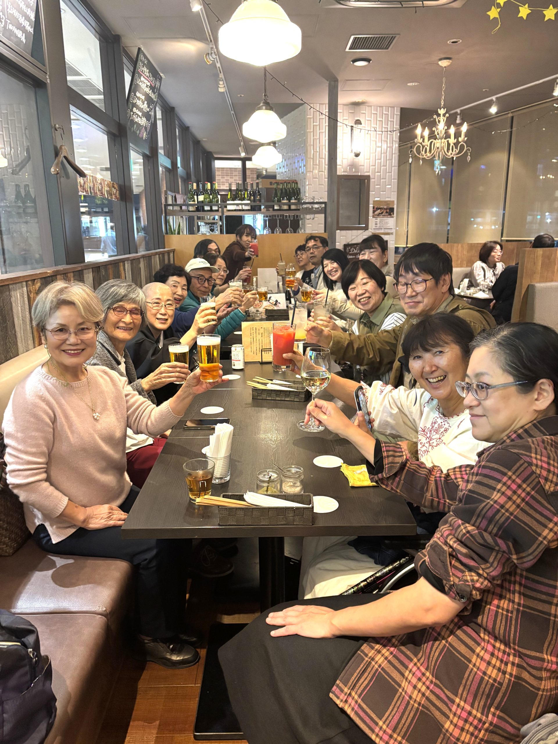 懇親会もご希望が多く、こちらも超満席! 席をギュウギュウと詰めて座りました。お話は盛り上がり、幸せエネルギーで包まれました。皆様の人生が急上昇すること間違いありません。